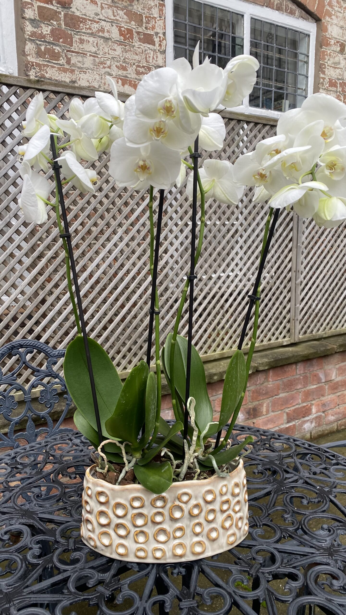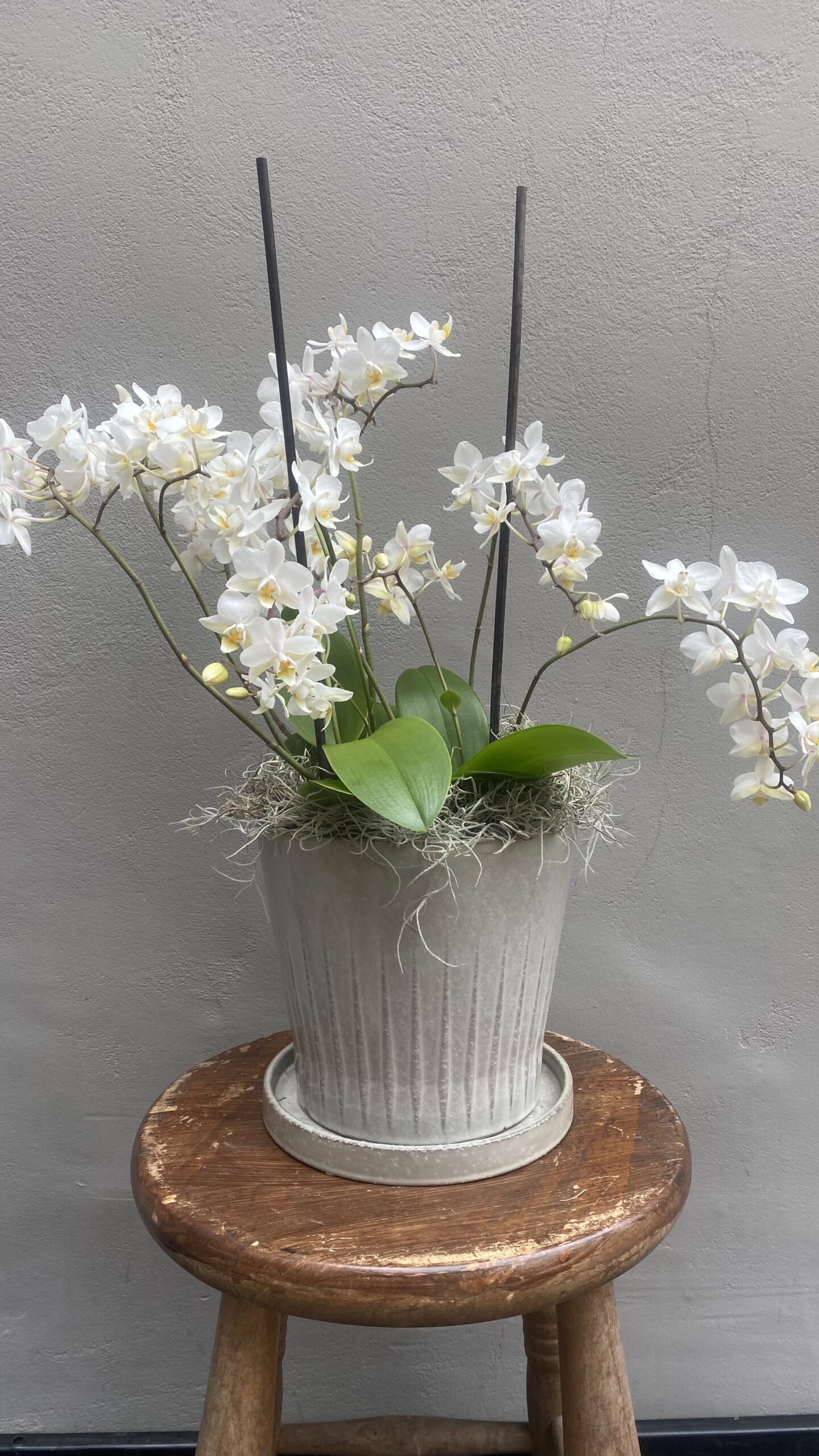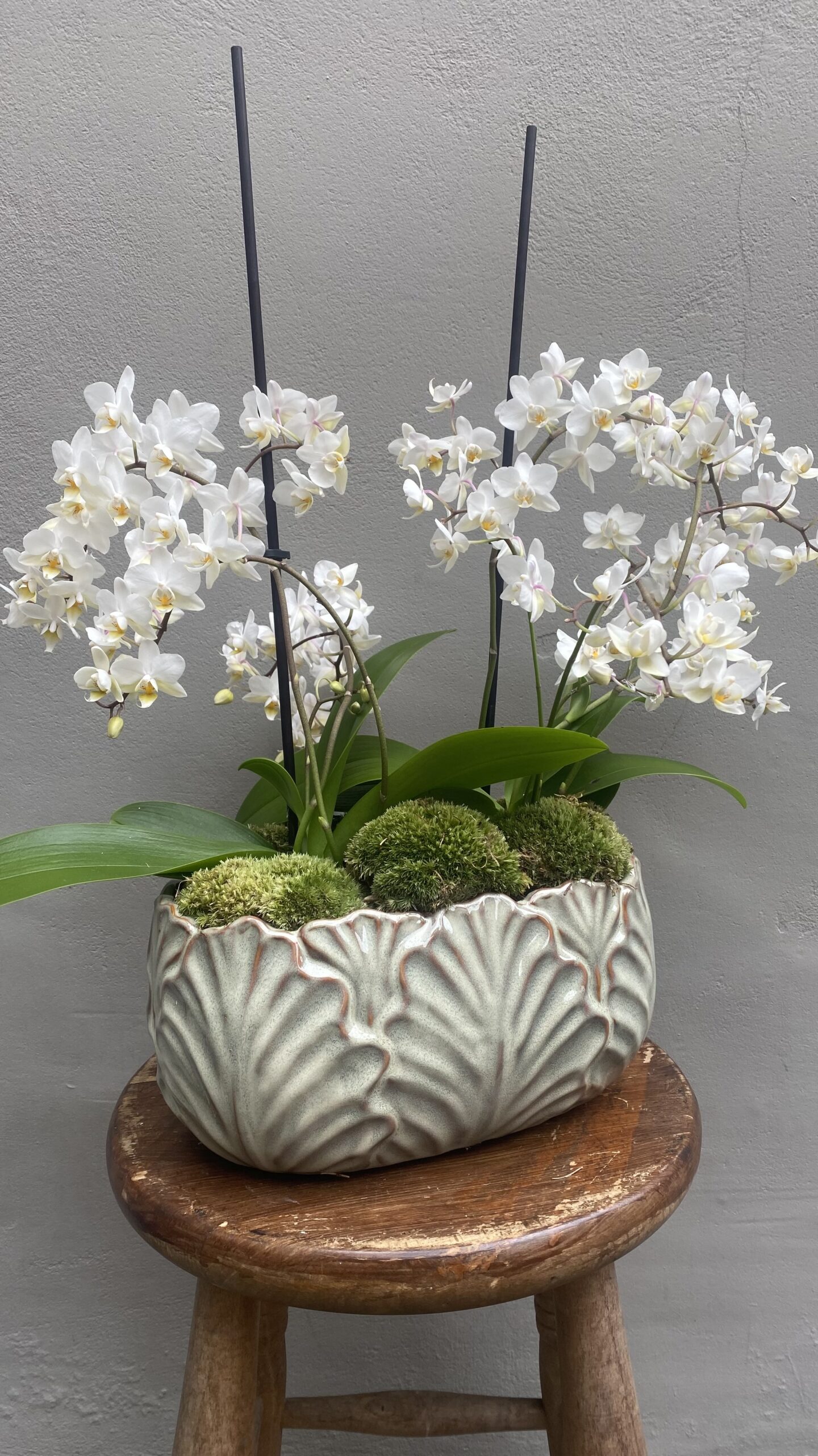 A cluster of orchid plants nestled into a stylish ceramic bowl and decorated with lush green bun moss. A real show-stopper arrangement